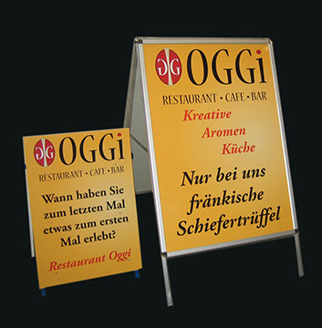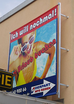 Roll Up Banner oder Leinwände. Wir nutzen ausschließlich UV-beständige und für den Außenbereich geeignete Tinte.